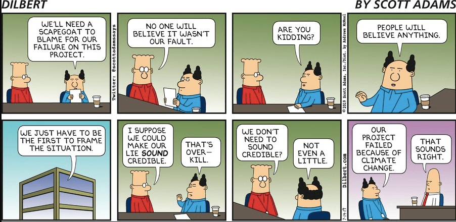 The worst thing is having to deal with the idiots out there who buy into this Gaia religion like Tom Raftery of Greenmonk and James Governor of Redmonk and Greenmonk. Our executives in a briefing after a different Green Day analyst conference in London actually called James a wanker and Tom a whiner after the event due to their outbursts and views as they interrupted the entire day. Greenmonk has since gone dormant for lack of money, facts and believable content on climate. Their credibility was shot when they wanted a carbon tax at a dollar a pound. James told me the real truth was he wanted to make money while trying pretend that they were doing it to save the planet, making money being the operative words (see the above extortion tactics). I put the Dilbert cartoon in specifically for O’Reilly, Raftery and Governer – the 3 stooges.