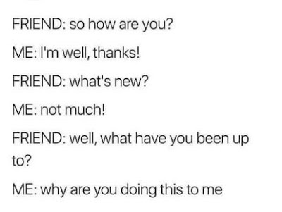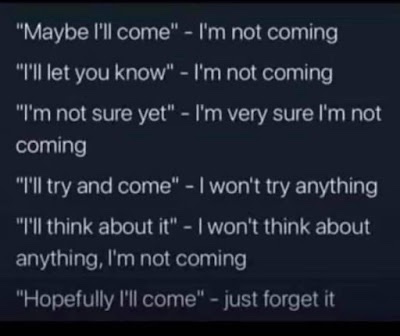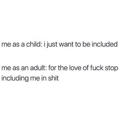 All true, but in no particular order. I wonder if others relate to this? Sure, I don’t feel like this all the time, but let some person I’m not comfortable with try to include me on something I know I dread and………