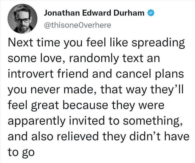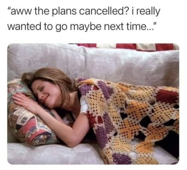 This is 1000 words in each picture. I think the most relatable is how good cancelled plans are. What a relief. The one about how it is the best present you can give an introvert is spot on.