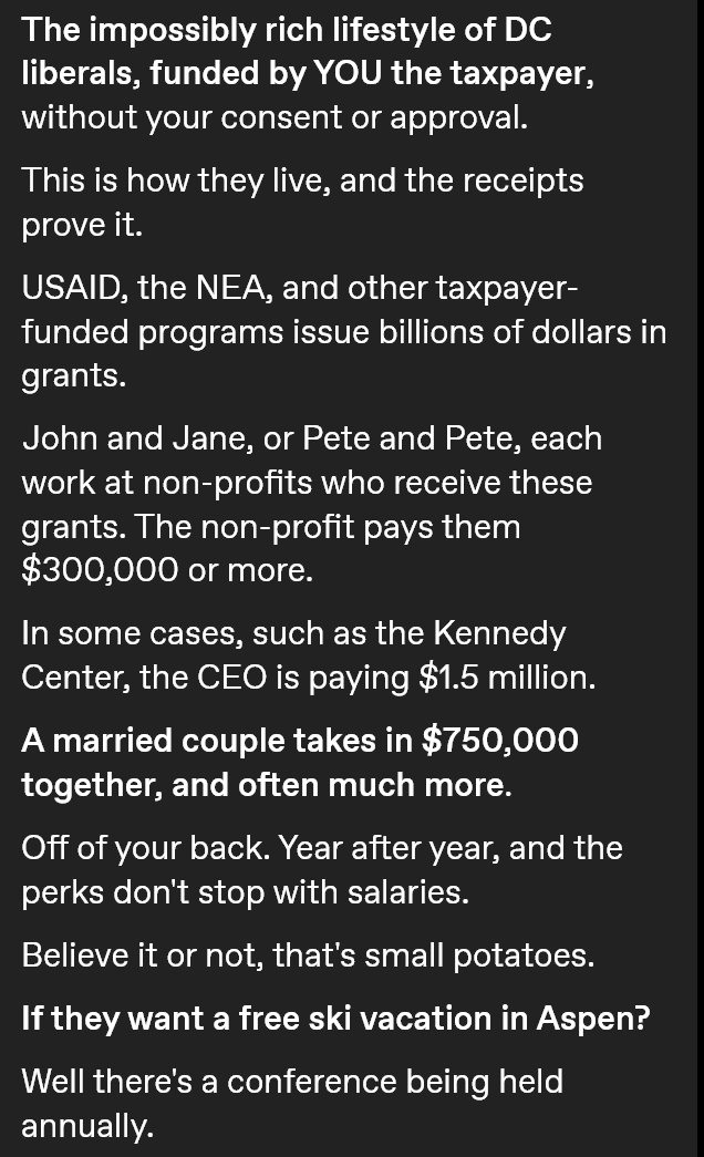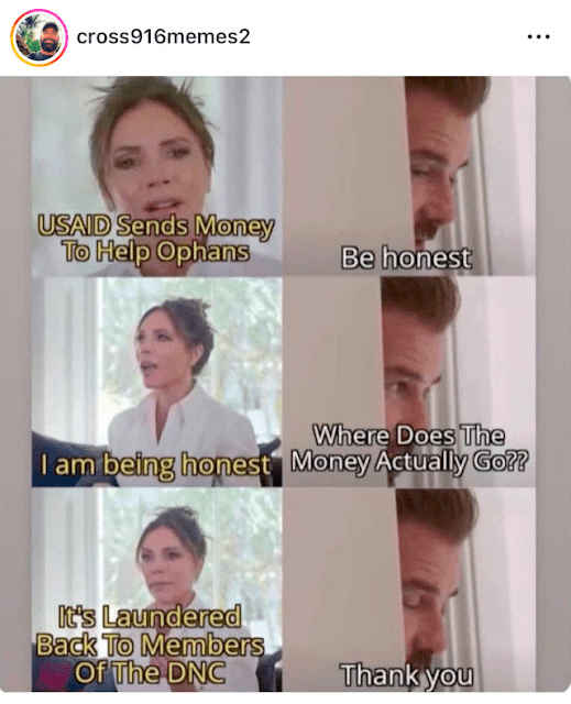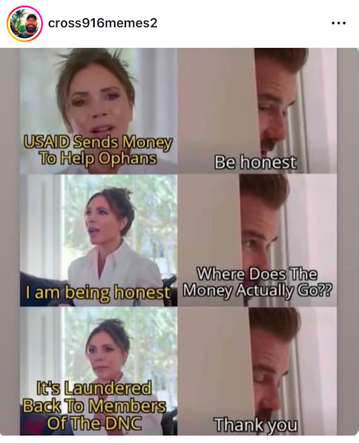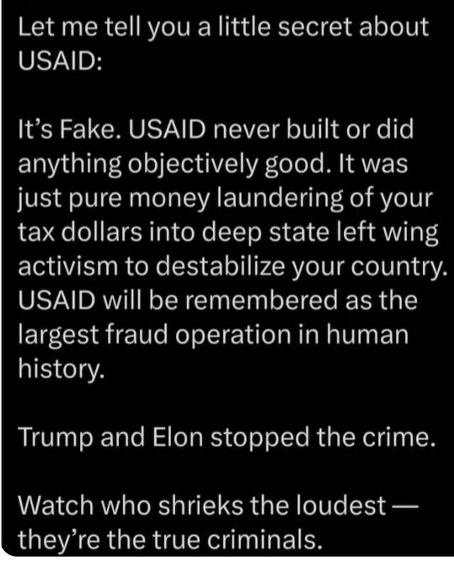 Direct quote: “This is worse than 9/11 for Democrats. USAID is the primary vessel they use to achieve their political agenda. USAID is and always has been the primary source of funding for their influence peddling schemes and for their indirect sources of income”