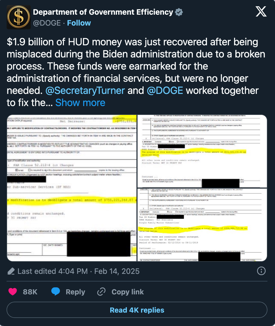 DOGE: U.S. Government Agencies Terminate 67 Wasteful Contracts Worth $1.4 Billion