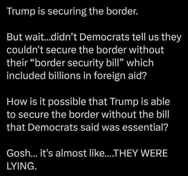 1) Wipe out a 2,000 mile border. Allow 10-million foreign nationals to enter unlawfully. Have no audit of any; nullify all federal immigration laws. Let toxic drugs in that kill 100,000 Americans a year. Give free support for those millions who broke the law. Smear any objectors as racists and xenophobes.
