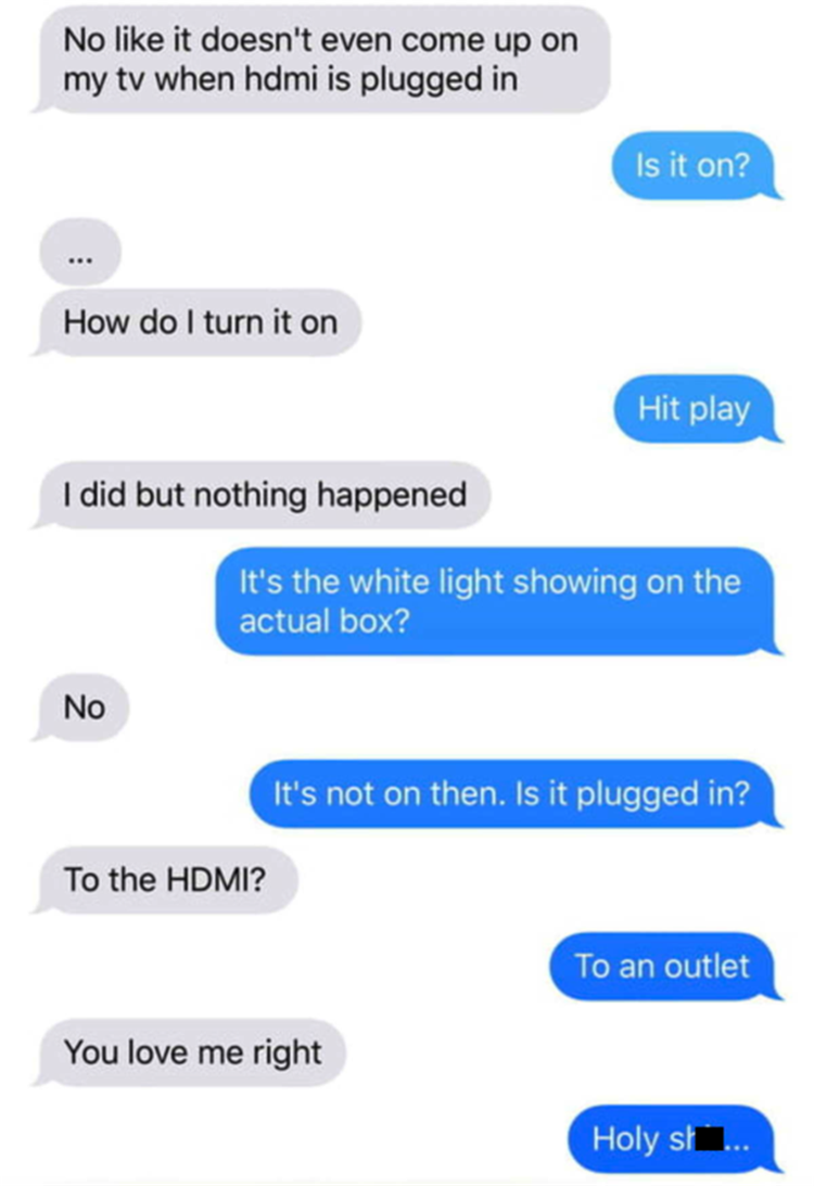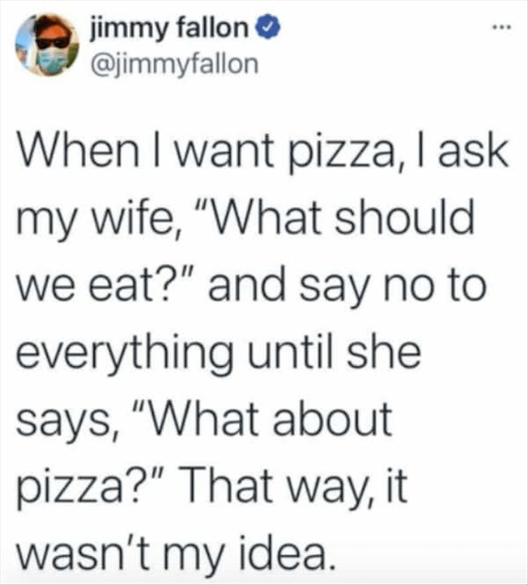 Here is my day. (Wife or T) Which chicken should we get out? Me: get out the one in the package. T: but they are too big. Me: then get out the other one. T: but they won’t work will they? Me: use whatever you want. T: but which chicken should I get out? Me: whatever works, it’s chicken. T: what do you think I should use. Me: (to myself: whatever the fuck you want, you aren’t listening anyway) You asked me and I told you and you don’t want to do it so look in the freezer and get out some chicken. T: but you bought them and I thought you bought another one. Me: look in the freezer and find the right one (about to shoot myself).
