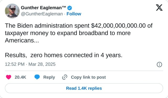 Alas, the reality turned out to be completely different. Democrats pushed diversity, equity, and inclusion (DEI) requirements and failed to establish fast and convenient verification processes for applicants. This predetermined that the initiative would be inefficient. As of January 2025, many communities are reported to face hurdles due to inadequate connectivity.